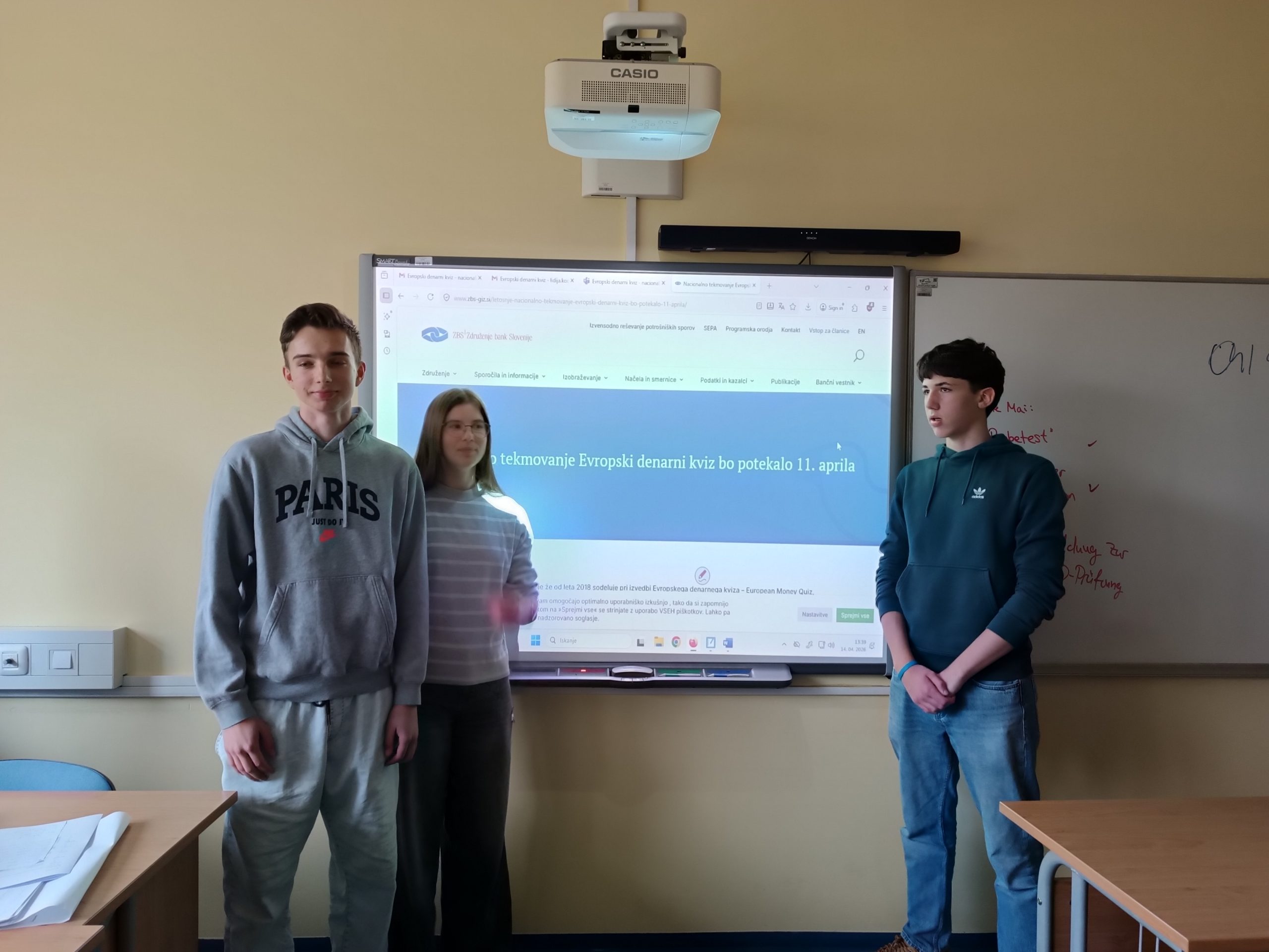 Danes je potekalo nacionalno tekmovanje Evropski denarni kviz, ki je združilo več kot 500 učencev in dijakov, starih med 13 in 15 let, iz 17 šol po Sloveniji. Naziv najboljših so si priborili dijaki 1. letnika II. gimnazije Maribor. Prvo mesto je osvojil Naj Strmšek, drugo Jure Petek, tretje mesto pa Hana Jarh (na fotografiji od leve proti desni), pod mentorstvom Lidije Kodrin.